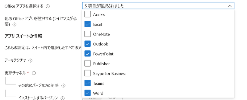アーキテクチャ> Microsoft 365 Apps の 32 ビットバージョンと 64 ビットバージョンのどちらを割り当てるかを選択します。